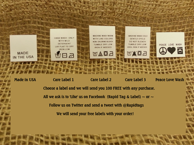 BlogLimited time offer! 100 free with any purchase. Posted on August 19, 2013August 19, 2013 by admin Choose a label and we will send you 100 free with any purchase. All we ask is to “Like” us on Facebook! Follow us on Twitter and send a tweet with @Rapidtags. Clothing labels with sequential numbers Natural Cotton Woven Clothing Labels are BACK IN STOCK!